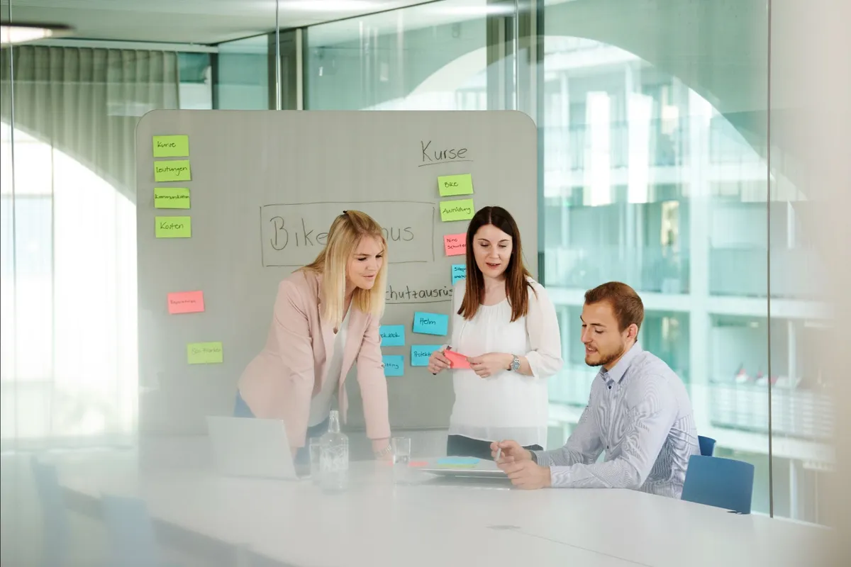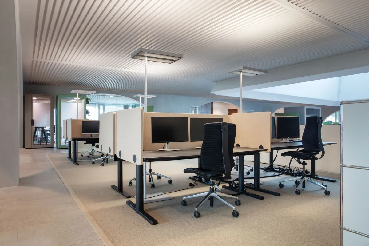 Die flexible, standortübergreifende Arbeitsumgebung wurde weiterentwickelt. Desk-Sharing, Begegnungszonen und neue Räume fördern Zusammenarbeit, Flexibilität und Effizienz. Second-Life-Möbel runden das Konzept ab.