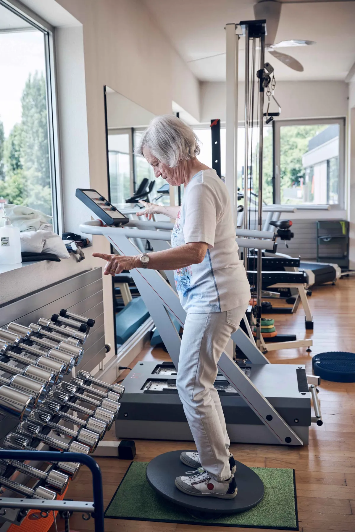 Due mesi e mezzo dopo l’operazione, la signora Haab scende agilmente le scale dal terzo piano con lo zaino da ginnastica sulle spalle: nel suo condominio di Stäfa l’ascensore non c’è, ma lei lo considera un vantaggio, perché salire e scendere le scale aiuta a mantenersi in forma. Negli ultimi metri lascia persino la presa sul corrimano, naturalmente sempre con cautela. Poi si mette alla guida della sua Daihatsu e si reca da «Physio Stäfa» per un allenamento in autonomia, dato che per questa settimana la fisioterapia vera e propria l’ha già fatta. Qui pedala sulla ciclette con una resistenza di già 45 watt, cammina in avanti, all’indietro e lateralmente sul tapis roulant e spinge contro la pressa un peso quasi pari ai suoi 52 chili. La signora Haab è grata per il sostegno terapeutico ricevuto nel suo percorso di guarigione, ma sa bene che in quanto paziente anche lei ha delle responsabilità.
